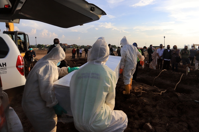 Petugas memakamkan jenazah dengan protokol COVID-19 di TPU Rorotan, Cilincing, Jakarta Utara, Selasa (30/6/2021). Lahan dengan luas mencapai dua hektar ini sedikitnya telah menampung 900 jenazah warga terpapar Covid-19 telah dimakamkan di TPU Rorotan seja
