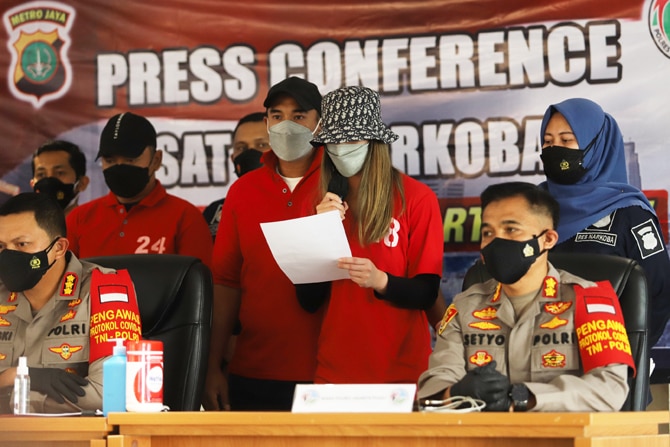 Nia Ramadhani dan Ardi Bakrie ditampilkan berbaju tahanan terkait kasus narkoba saat Jumpa Pers Di Polres Jakarta Pusat, Sabtu (10/7/2021). Ditemani suaminya Nia Ramadhani membacakan surat berisi penyesalan dan permintaan maaf atas kasus narkoba yang men