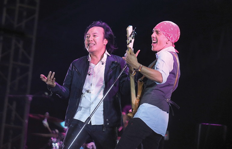 ENERGIK: Aksi panggung Ari Lasso dan Yuke Sampurna dalam konser reuni Dewa 19. (IMAM HUSEIN/JAWA POS)