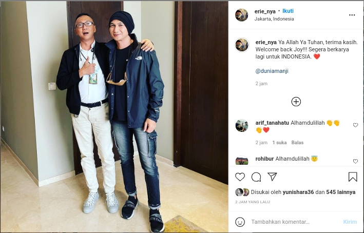 Sementara dalam postingan feed Instagram, Erie juga memberi keterangan tentang ungkapan rasa syukur kepada Tuhan atas bebasnya Anji. Namun Erie menaruh harapan supaya adiknya itu bisa memberikan hal positif ke depannya. "Ya Allah Ya Tuhan, terima kasih. Welcome back Joy!!! Segera berkarya lagi untuk INDONESIA," tulisnya memberi keterangan foto.