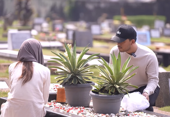 Thariq Halilintar dan Aaliyah Massaid ziarah ke makam mendiang Adjie Massaid di TPU Jeruk Purut Jakarta Selatan.