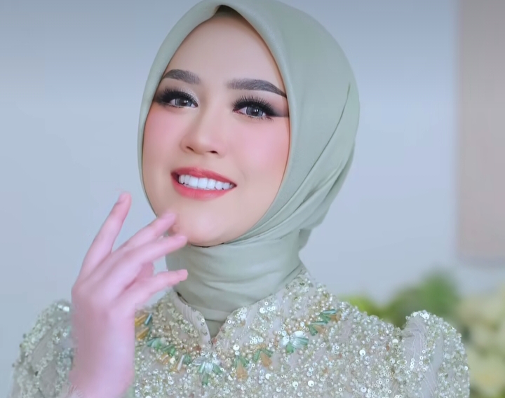 Makeupnya yang simpel dengan eyeshadow sedikit gelap dan warna bibir merah muda, menambah kecantikan Happy Asmara di momen tersebut.