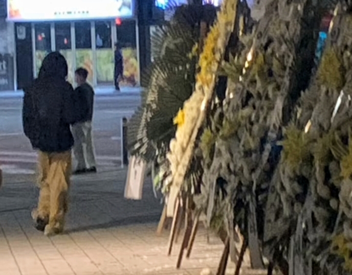 Menurut seorang netizen, seseorang yang keluar dari gedung, melihat karangan bunga, menangis, dan kembali ke dalam gedung.