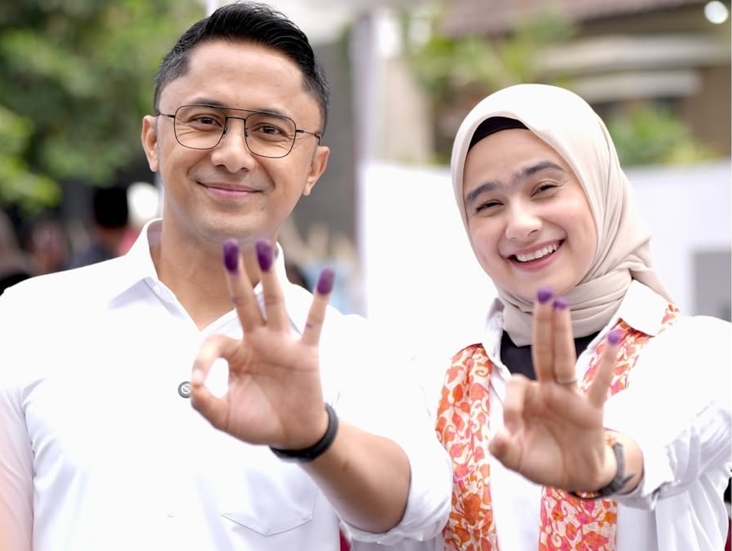 Sonya Fatmala dan Hengky Kurniawan memperlihatkan jarinya telah terkena tinta tanda telah mencoblos di Pilkada Serentak 2024. (sonyafatmala)
