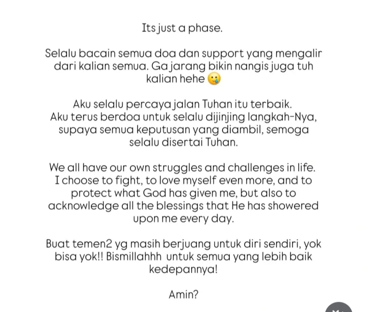 Ia juga mengungkap, bahwa semua ada cobaan, dan ia memilih untuk berjuang untuk mencintai dirinya sendiri serta selalu bersyukur.