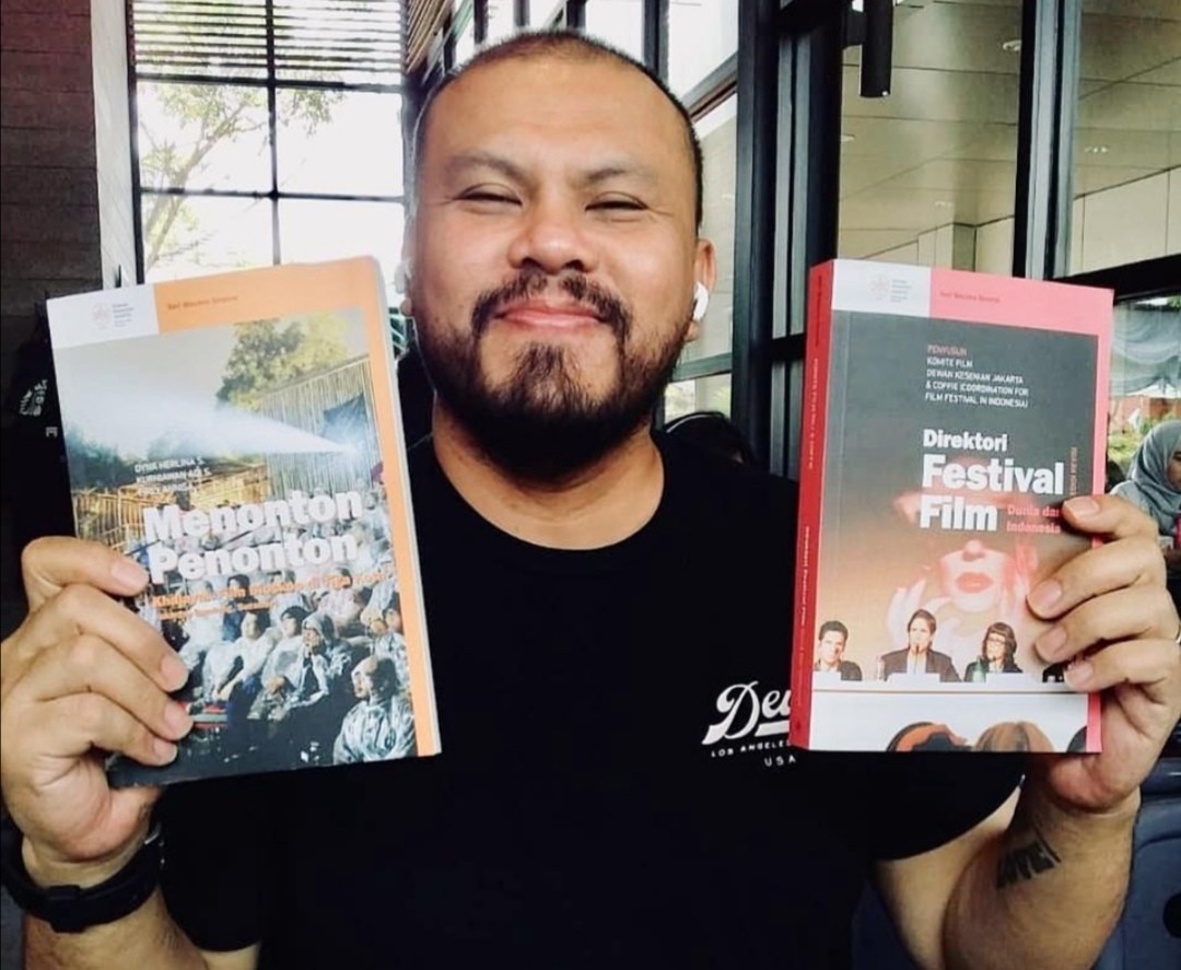 Joko Anwar dan dua buku pertama Seri Wacana Sinema besutan Komite Film Dewan Kesenian Jakarta. (Lulu Ratna/Dok./DKJ)