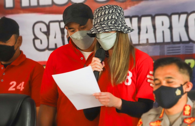 Nia Ramadhani dan Ardi Bakrie ditampilkan berbaju tahanan terkait kasus narkoba saat Jumpa Pers Di Polres Jakarta Pusat, Sabtu (10/7/2021). Ditemani suaminya Nia Ramadhani membacakan surat berisi penyesalan dan permintaan maaf atas kasus narkoba yang men