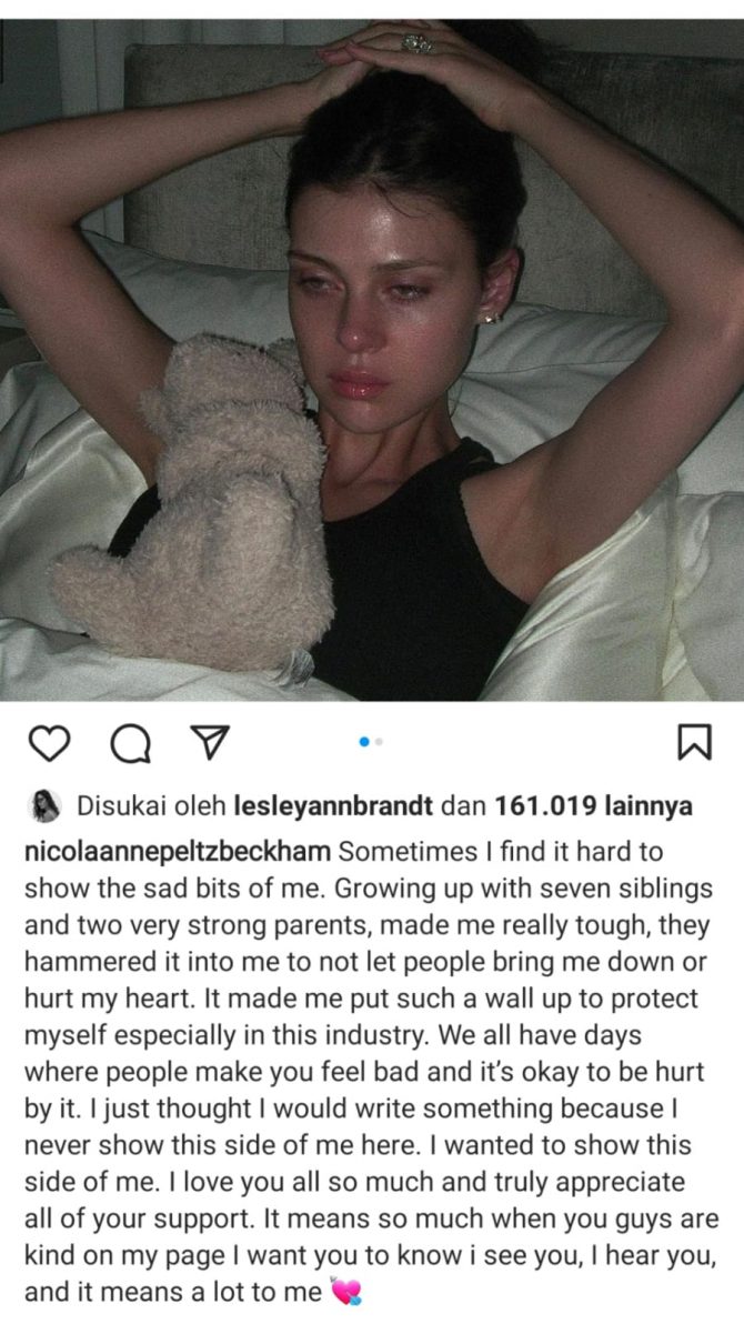 Nicola Peltz Beckham pun bereaksi. Ia membagikan unggahan Instagram yang samar bertema 'terluka' hanya beberapa hari setelah rumor perseteruannya dengan ibu mertuanya, Victoria Beckham, pertama kali dilaporkan oleh Page Six. Aktris dan putri investor miliarder Nelson Peltz mem-posting foto dirinya dengan mata merah dan berair yang melekat pada keterangan emosional.