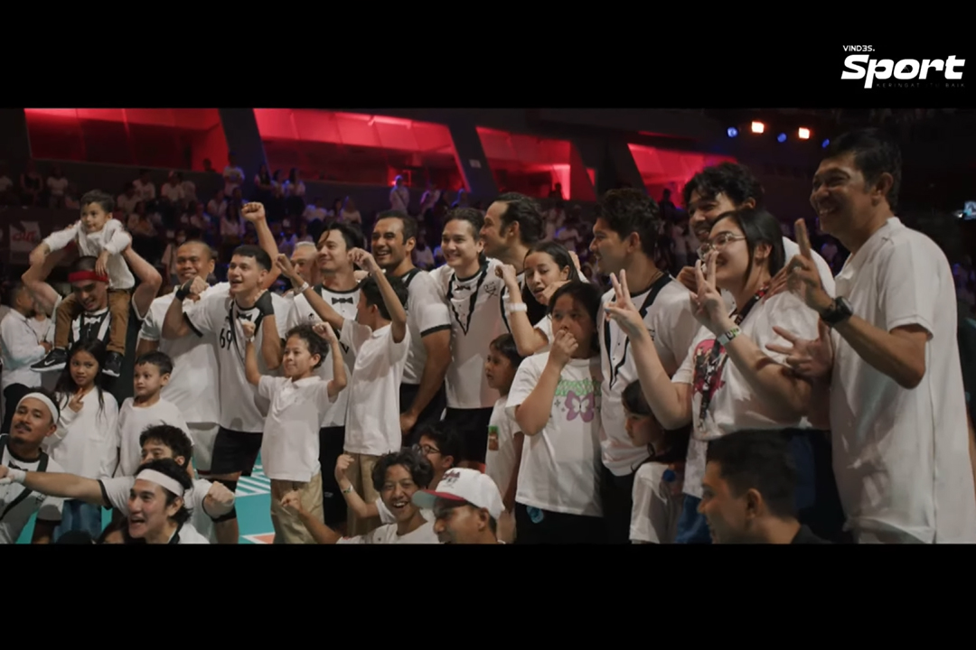 Para pemain The Actors merayakan kemenangan pertandingan Bahkan Voli bersama keluarga. (Sumber: Tangkapan Layar YouTube Vindes Sport Bahkan Voli)