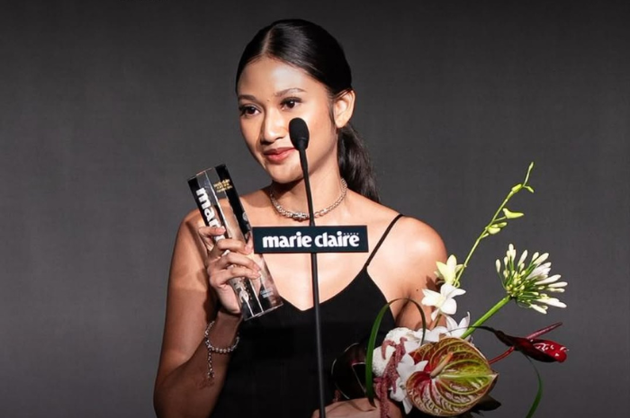 Claresta memegang piala penghargaan Rising Star Award. (Instagram @filmpangku)