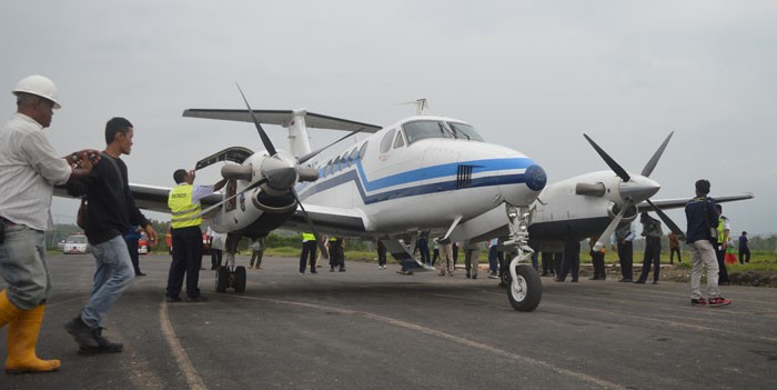 JawaPos.com - Pesawat King Air B200GT sukses mendarat di Bandara Ngloram, Kecamatan Cepu, Blora, kemarin. Meski terlambat tiga jam dari jadwal semula pukul 13.00, pendaratan pertama di bandara yang terbengkalai sejak 36 tahun lalu itu berhasil dengan sempurna.