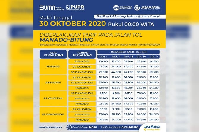 JawaPos.com - PT Jasa Marga (Persero) Tbk menyampaikan, terhitung mulai hari Jumat (30/10), pukul 00.00 WITA, tarif Jalan Tol Manado-Bitung Ruas Manado-Danowudu diberlakukan. Direktur Utama Jasa Marga, George I.M.P Manurung menyampaikan, pemberlakuan tarif ini berdasarkan Keputusan Menteri Pekerjaan Umum dan Perumahan Rakyat (PUPR) No. 1494/KPTS/M/2020 tanggal 14 Oktober 2020 tentang Penetapan Golongan Jenis Kendaraan Bermotor dan Besaran Tarif Tol Pada Jalan Tol Manado-Bitung Segmen Manado-Simpang Susun Danowudu.