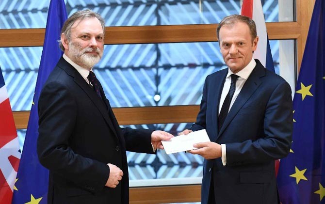 Perwakilan permanen Inggris di EU, Tim Barrow, pun sudah menyerahkan surat notifikasi formal enam halaman kepada Presiden Dewan Eropa Donald Tusk di Brussels. Barrow tiba di markas besar Dewan Eropa Rabu (29/3) pagi. Menumpang Jaguar hitam, Barrow membawa tas hitam yang berisi surat resmi permintaan Inggris untuk melepaskan diri dari EU.