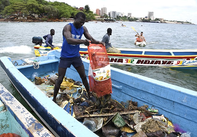 ACARA TAHUNAN: Seorang pria mengosongkan kantong berisi sampah saat kampanye Clean-up Day di Dakar, Senegal (15/9). (SEYLLOU/AFP)