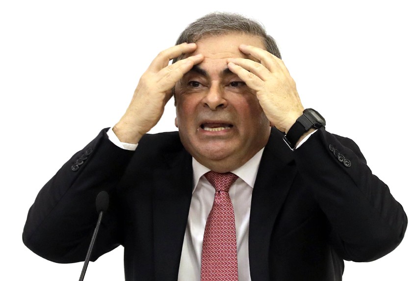 Former Renault-Nissan boss Carlos Ghosn gestures as he addresses a large crowd of journalists on his reasons for dodging trial in Japan, where he is accused of financial misconduct, at the Lebanese Press Syndicate in Beirut on January 8, 2020. - The 65-ye