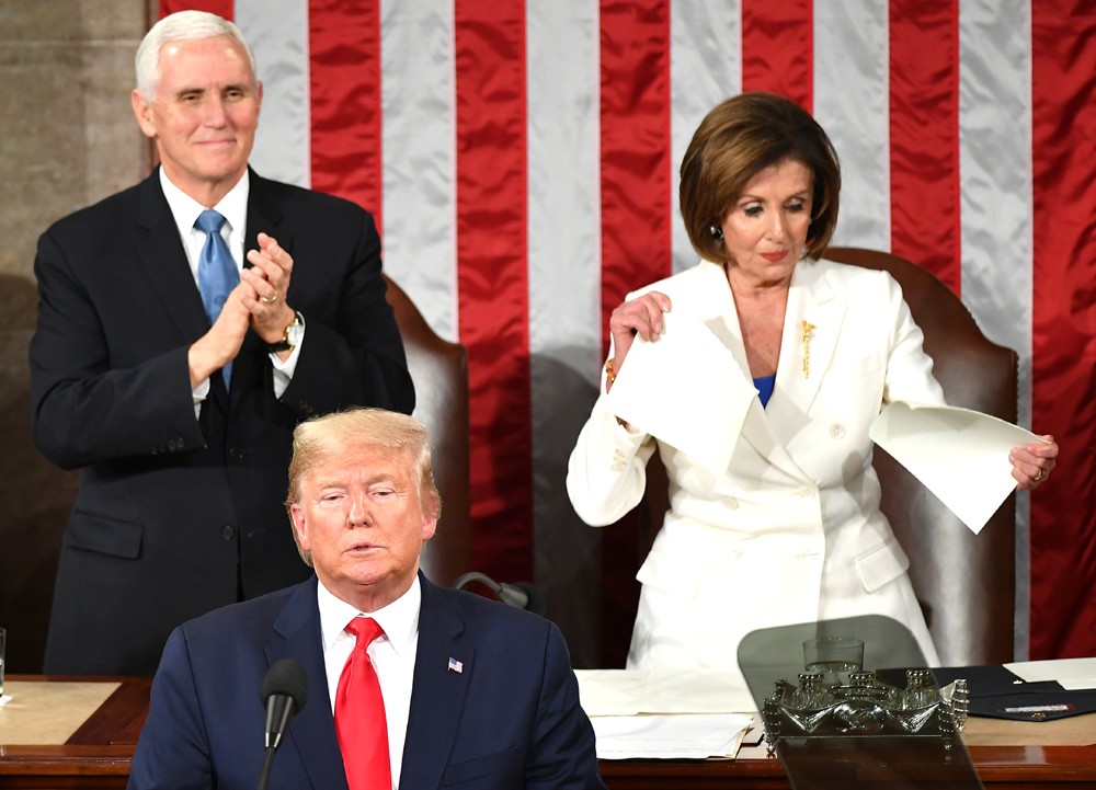 Di tengah keramaian dan sorotan kamera televisi nasional, Ketua Dewan Perwakilan AS Nancy Pelosi ikut berdiri. Bukan untuk bertepuk tangan. Politikus Demokrat itu merobek kertas dan membuangnya di meja.