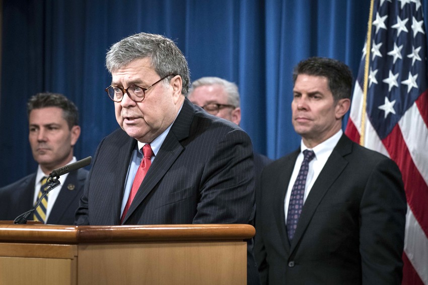 WASHINGTON, DC - FEBRUARY 10: Attorney General William Barr participates in a press conference at the Department of Justice along with DOJ officials on February 10, 2020 in Washington, DC. Barr announced the indictment of four members of China