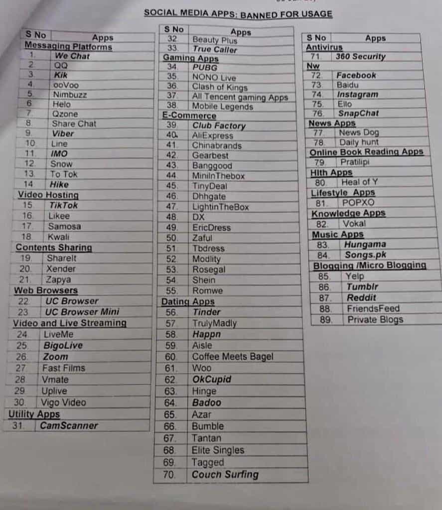 Daftar aplikasi yang menurut laporan diminta oleh personel militer India untuk dihapus dari ponsel pintar mereka dibagi menjadi beberapa kategori seperti platform pengiriman pesan (Kik, Viber, Hike, dan lainnya), hosting video (TikTok, Likee, dan lainnya), berbagi konten (Shareit, Xender dan lainnya), browser web (UC Browser dan UC Browser Mini), video dan streaming langsung (BigoLive, Zoom dan lainnya), dan aplikasi utilitas (CamScanner, Truecaller, dan lainnya).