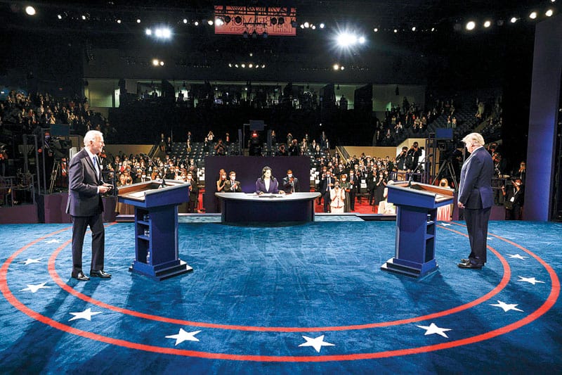 ADU ARGUMEN: Joe Biden (kiri) dan Donald Trump berhadapan dalam debat terakhir di Belmont University, Nashville, Kamis (22/10) lalu. (IN BOURG/POOL VIA AP)