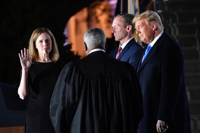 US President Donald Trump watches as Supreme Court Associate Justice Clarence Thomas swears in Amy Coney Barrett as a US Supreme Court Associate Justice, flanked by her husband Jesse M. Barrett, during a ceremony on the South Lawn of the White House Octob