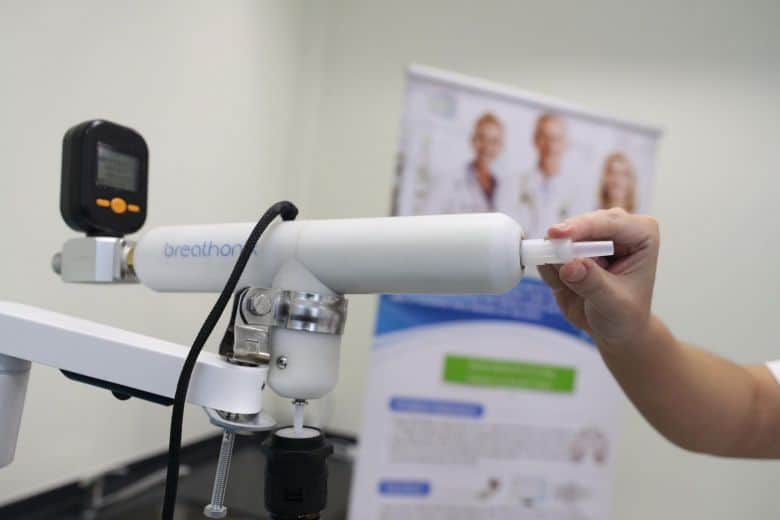 Seseorang cukup meniup ke corong sekali pakai yang terhubung ke alat pengambil napas. Spektrometer massa menganalisis partikel tak terlihat yang disebut senyawa organik volatil (VOC) dalam napas seseorang.