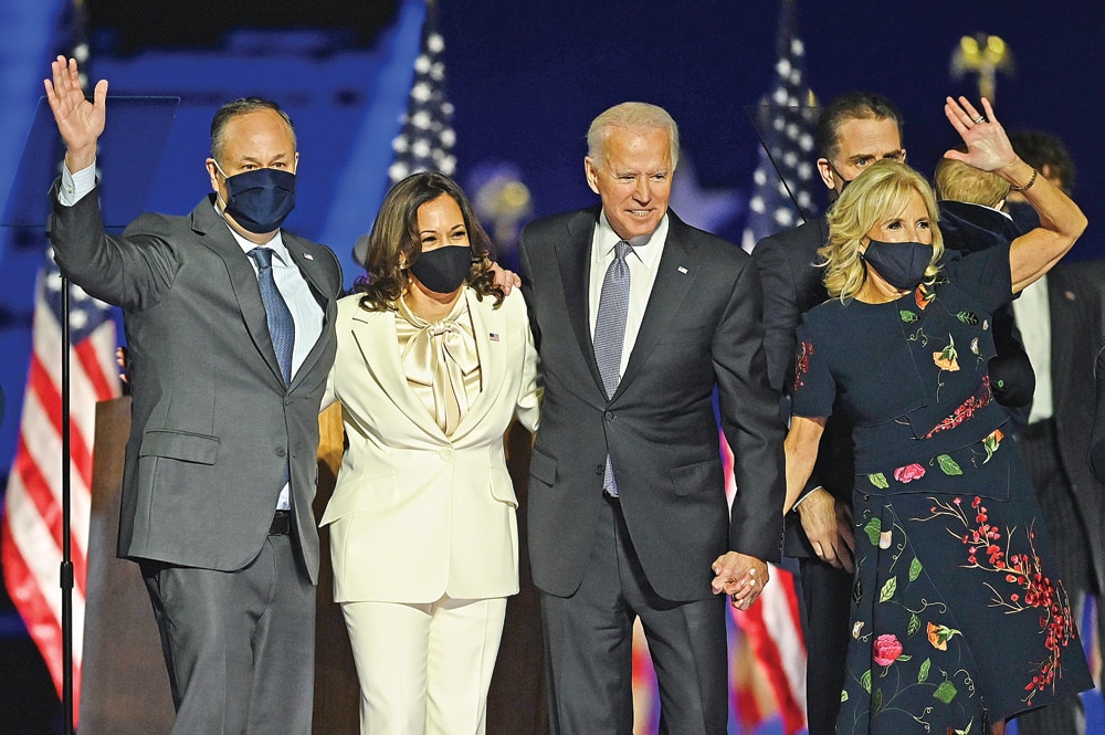 SEJARAH BARU: Presiden dan wakil presiden terpilih AS bersama pasangan masing-masing. Dari kiri, Douglas Emhoff, Kamala Harris, Joe Biden, dan Jill Biden. Mereka mendeklarasikan kemenangan pada pilpres AS Sabtu (7/11). (JIM WATS ON/AFP)