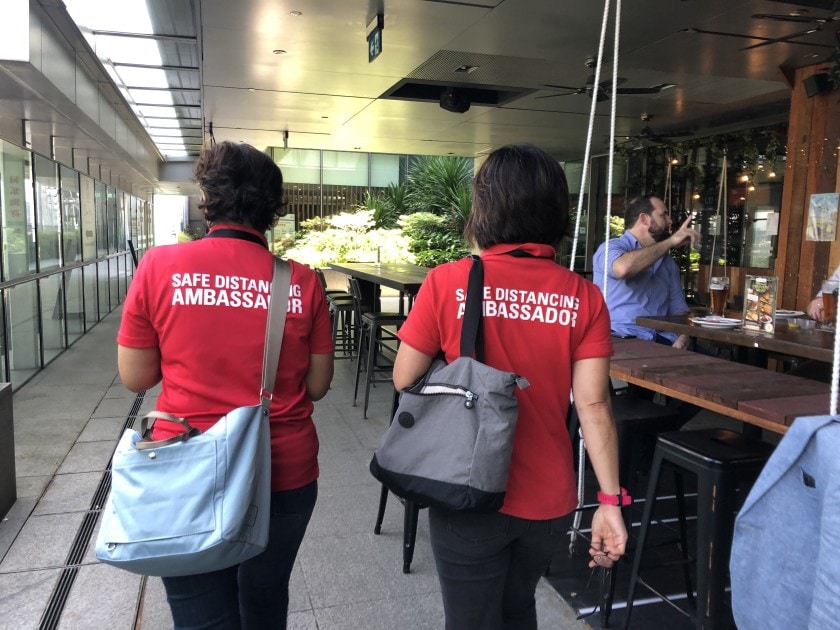 Mengenakan kaos polo merah dengan tulisan "Duta Jarak Aman" tertera di bagian belakang, Singapura memiliki pasukan merah yang siap menegur siapa saja yang tak patuh protokol kesehatan. Salah satu anggotanya, Rugayah Noordin dan Fiona Tay berkeliling di mal kelas atas. Banyak pelanggaran ditemukan.