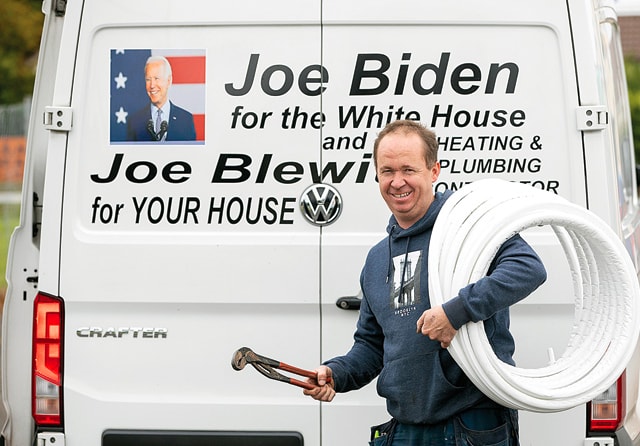 KELUARGA JAUH: Joe Blewitt, sepupu kandidat presiden AS Joe Biden, berpose di depan mobil van miliknya saat ditemui di Ballina, kota leluhur Biden di Irlandia, pada 7 Oktober 2020. (PAUL FAITH/AFP)