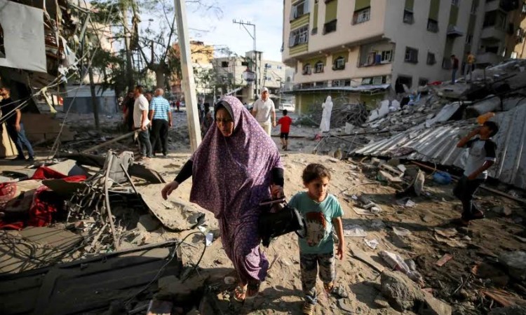 Penduduk Palestina di jalanan Gaza yang rusak setelah Israel melancarkan serangan udara balasan pada Sabtu (7/10)