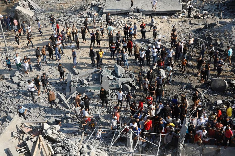 Warga Palestina mencari korban di bawah reruntuhan setelah serangan Israel, di Khan Younis di Jalur Gaza selatan, 14 Oktober 2023.