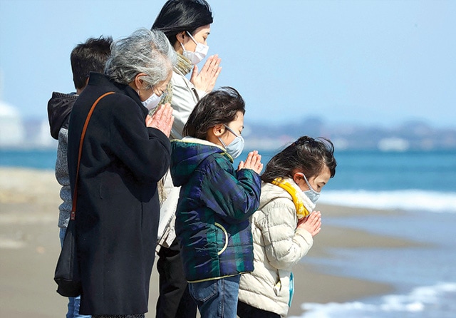 SEMOGA TAK TERULANG: Penduduk setempat berdoa untuk korban gempa dan tsunami di pantai di Sendai, Prefektur Miyagi, pada Kamis (11/3), memperingati 10 tahun gempa berkekuatan 9,0 SR yang memicu tsunami dan bencana nuklir. (STR/JIJI PRESS/AFP)