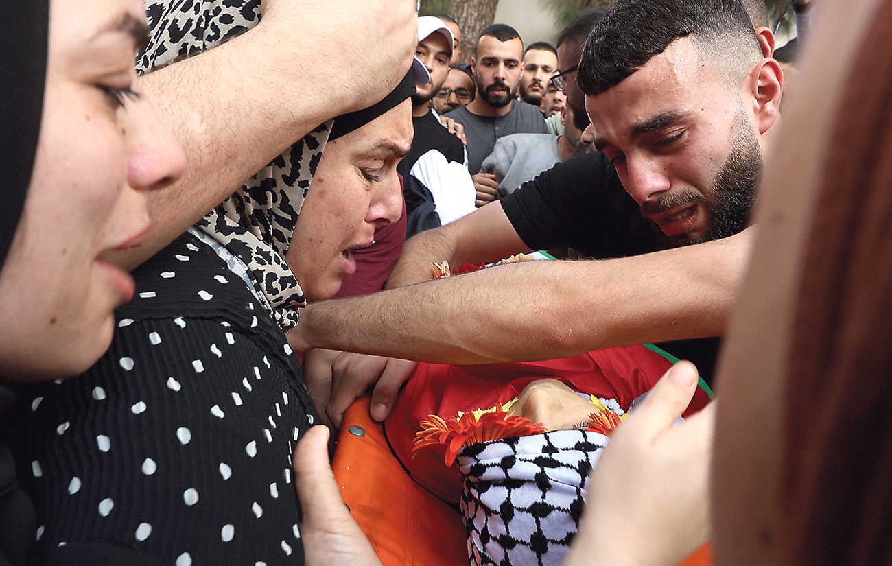 TANGIS: Kerabat berduka atas meninggalnya Ayham Sahferi akibat serangan bom Israel saat pemakamannya di Ramallah, Tepi Barat, kemarin.