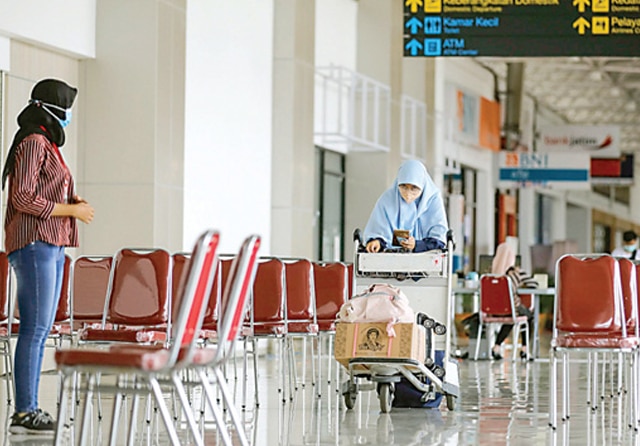 ANTISIPASI: Calon penumpang pesawat di Terminal 1 Bandara Internasional Juanda kemarin. Petugas memperketat pengawasan, menyortir penumpang, dan memperluas batasan pengantar. (Dipta Wahyu/Jawa Pos)