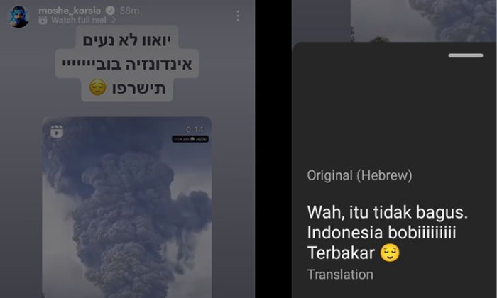 Cerita Instagram yang di unggah oleh @moshe_korsia itu berisi tentang ejekan terhadap warga Indonesia atas musibah letusan Gunung Marapi di Sumbar.