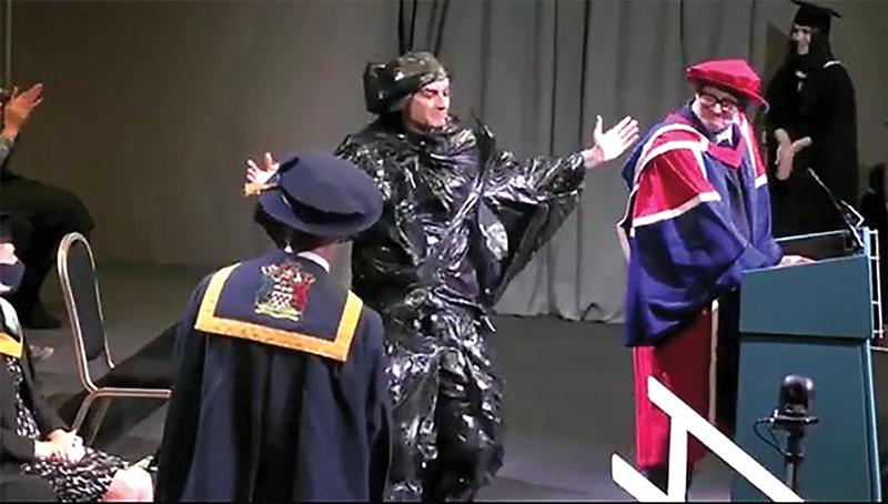 Tak ada toga, plastik sampah oke juga. Begitulah dia datang ke acara wisuda. Dengan menggunakan kantong plastik hitam besar yang membalut tubuhnya dari kaki hingga kepala. Tapi, penampilannya yang ”apa adanya” itu justru menuai pujian dari Peter Edwards, pelukis Inggris yang berpidato di acara kelulusan tersebut. ”Saya ingin mengucapkan selamat kepada pria berbaju kantong sampah. Saya pikir (bajunya) itu luar biasa,” tutur Edwards.