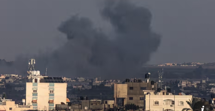 Gambar yang diambil dari Rafah menunjukkan asap mengepul di atas Khan Younis selama pemboman Israel di Jalur Gaza selatan pada Malam Natal. Sumber Foto: Said Khatib/AFP/Getty Images