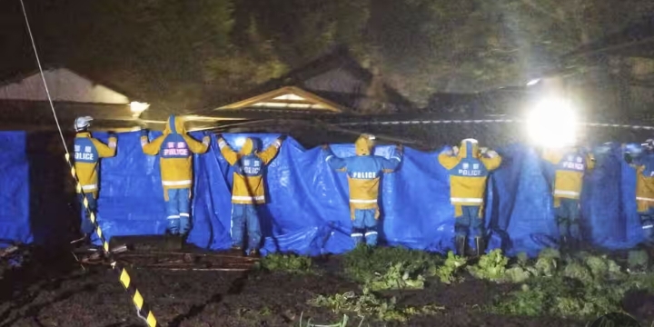 Petugas polisi menggunakan kain biru untuk privasi saat perempuan tua itu diselamatkan dari rumah yang runtuh di Suzu. Sumber Foto: 安祐輔/AP - Image