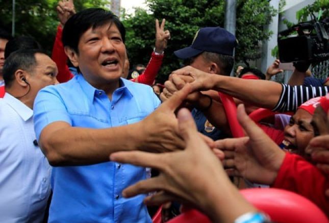 Mantan senator Ferdinand Bongbong Marcos Jr dan anak mantan diktator Ferdinand Marcos disambut pendukungnya. Romeo Ranoco/Reuters/Antara