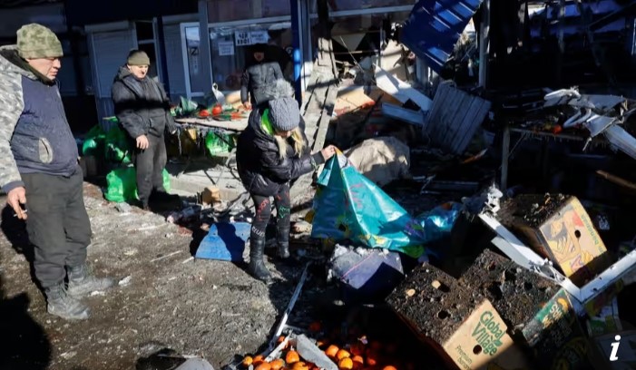 Bagian depan toko yang hancur dan pecahan kaca terlihat dalam video yang dibagikan media Pemerintah Rusia, bersama dengan mayat tergeletak di tanah di dekatnya. Seorang warga setempat bernama Tatiana mengatakan, mendengar proyektil datang dari atas, dan bersembunyi di bawah kios pasarnya.