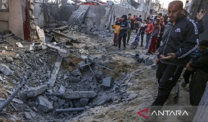 Warga Palestina melihat gedung tempat tinggal keluarga Tubasi dan Al-Sofi yang menjadi sasaran serangan Israel di Rafah, Gaza, 11 Februari 2024.
