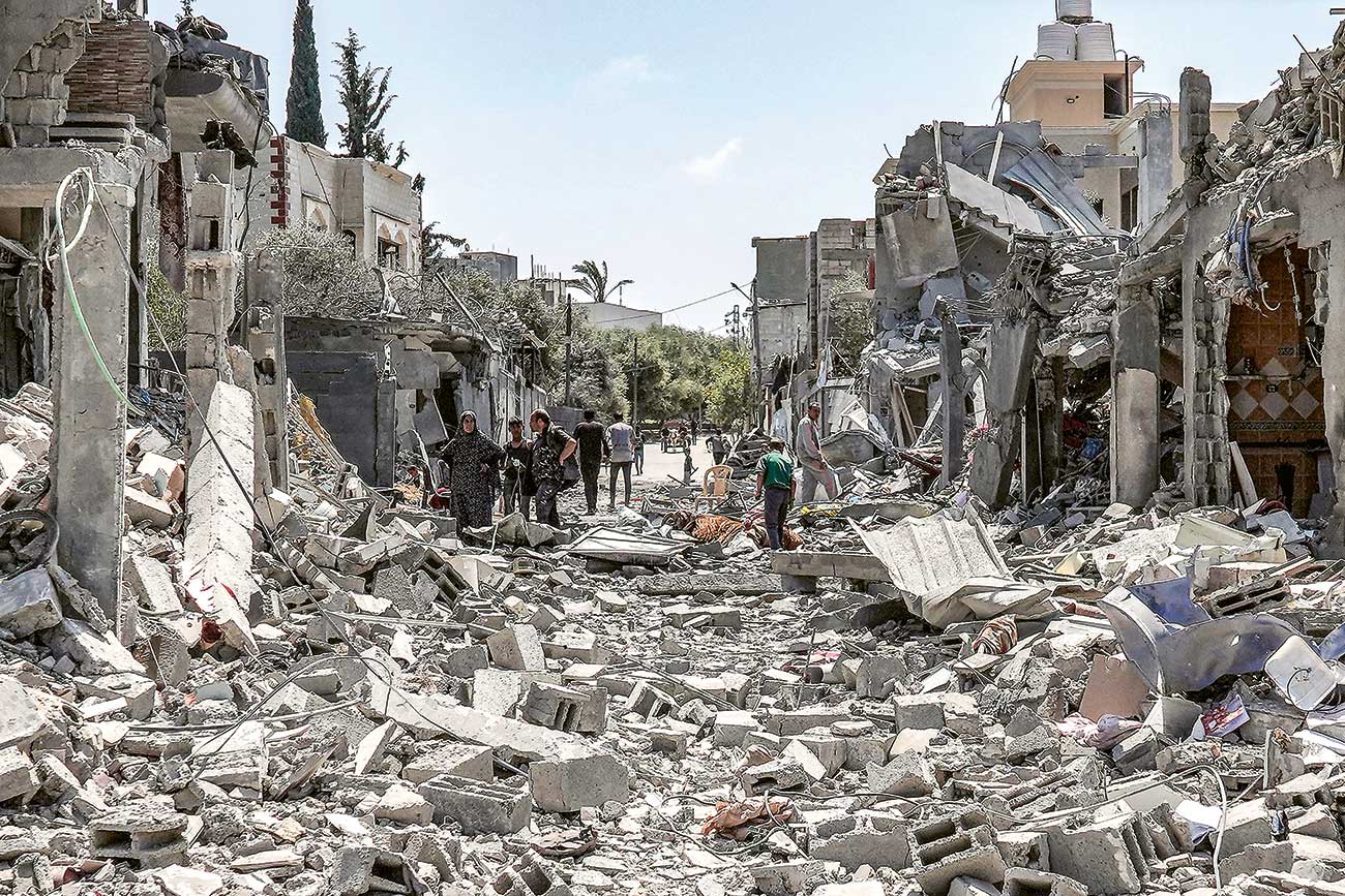 BERTAHAN DALAM PENDERITAAN: Warga Palestina mencari barang berharga di balik reruntuhan bangunan di kamp pengungsi Maghazi, pusat Jalur Gaza, kemarin 915/4).