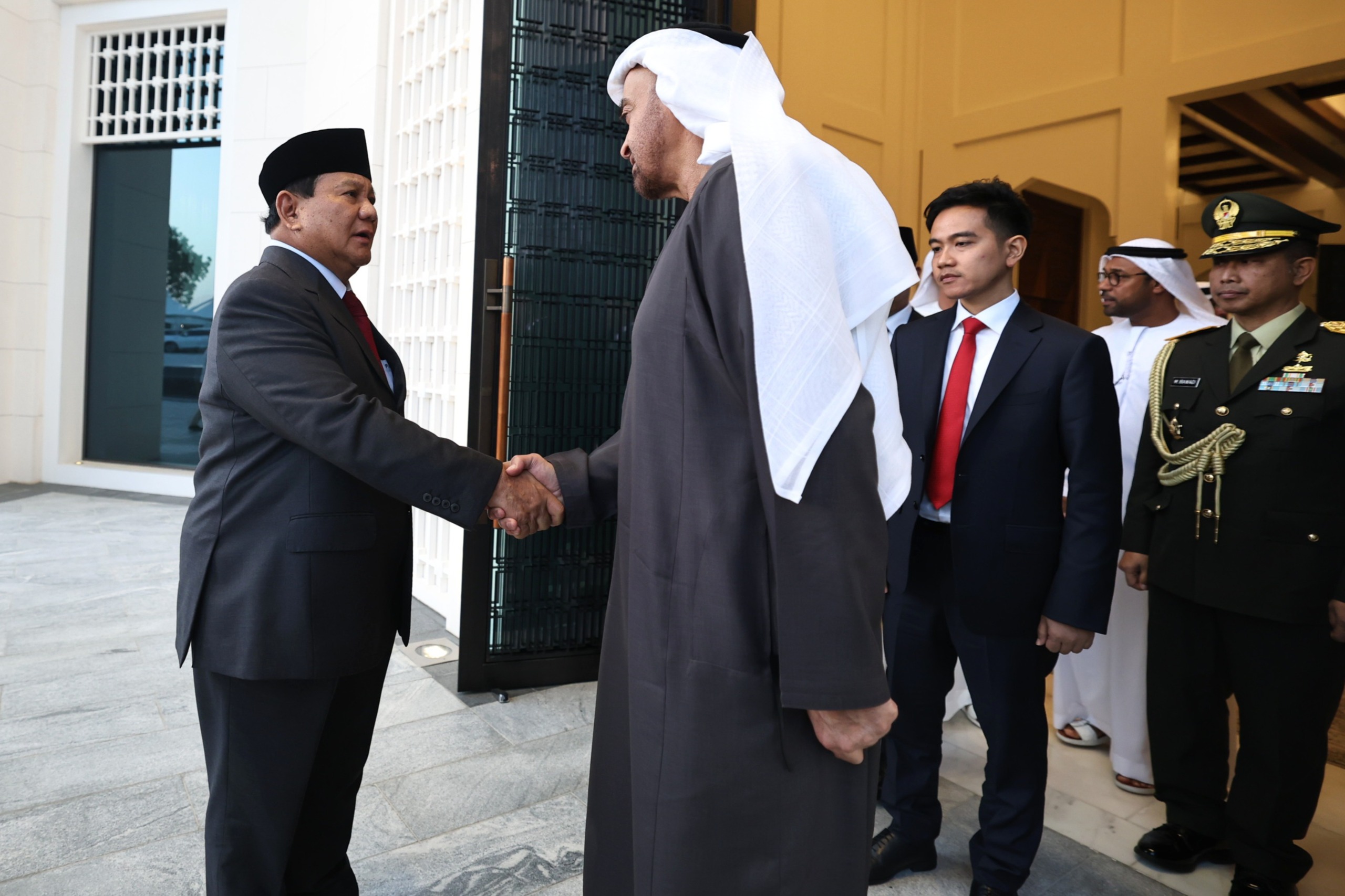 Presiden RI terpilih Prabowo Subianto dan Wapres RI Gibran Rakabuming Rakamenemui presiden Uni Emirat Arab (UEA) Syeikh Mohamed bin Zayed Al Nahyan (MBZ) di Istana Al Shati, Abu Dhabi, Senin, (14/5).