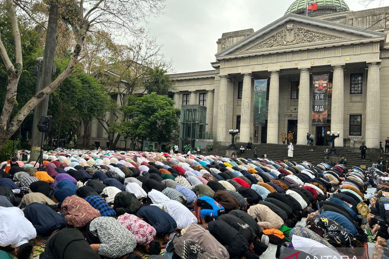 Ribuan warga negara Indonesia menunaikan shalat Idul Fitri di halaman Museum Nasional Taiwan (NTM) Taipei, Sabtu (22/4/2023). (ANTARA)