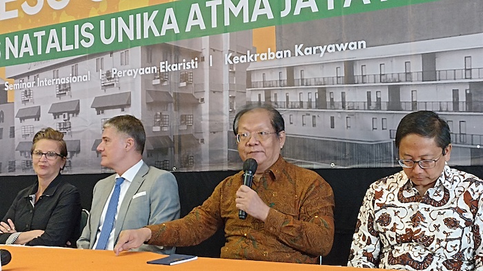 Senior Advisor Kementerian Luar Negeri Foster Gultom (dua dari kanan) menjelaskan perkembangan usulan Timor Leste jadi anggota ASEAN di kampus Unika Atma Jaya (2/6). Hilmi/Jawa Pos