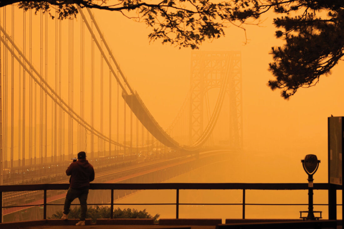 Langit di kota-kota besar AS menjadi kecokelatan. Bahkan, bau asap begitu menyengat. Itu akibat kiriman asap kebakaran hutan dari Kanada.