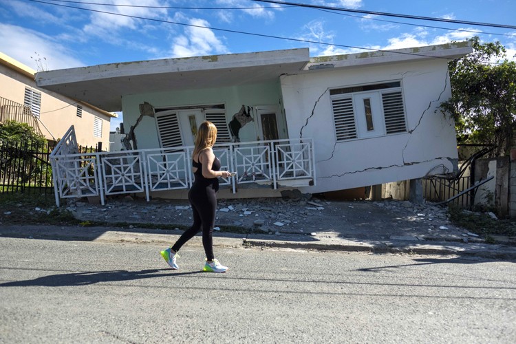 A woman passes by a house damaged by a 5.8 earthquake in Guanica, Puerto Rico on January 6, 2020. - A 5.8-magnitude earthquake shook Puerto Rico on January 6, 2020, toppling some structures and causing power outages and small landslides but there were no