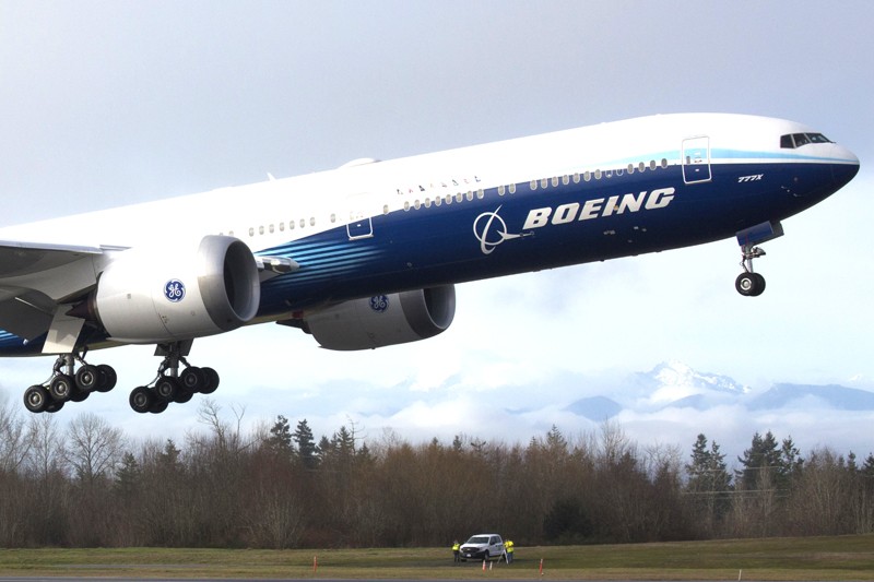 A Boeing 777X airplane takes off on its inaugural flight at Paine Field in Everett, Washington on January 25, 2020. - Boeing