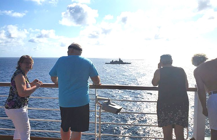 JawaPos.com - Beberapa penumpang MS Westerdam berdiri di atas geladak. Mereka menatap kapal frigate Bhumibol Adulyadej milik Angkatan Laut Thailand. Kapal itulah yang bertugas menjaga agar MS Westerdam tidak sampai bersandar di Pelabuhan Laem Chabang, Thailand, Rabu (12/2). Mau tak mau, kapal pesiar yang dioperasikan Holland America Line tersebut menurut.