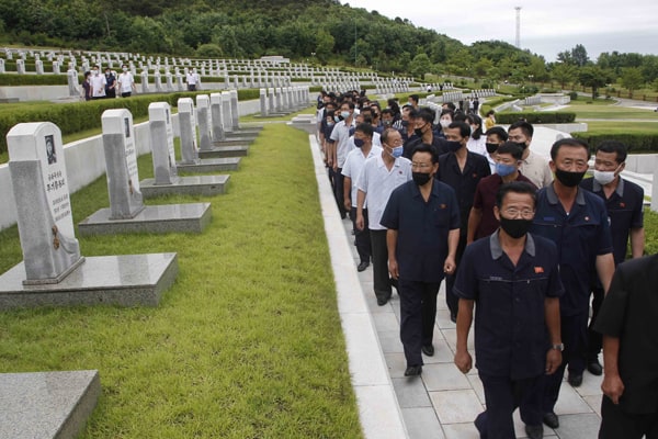 NUANSA PATRIOTIK: Warga Korut mengunjungi taman makam Martir Pembebasan Negeri di Pyongyang (Cha Song Ho/AP)