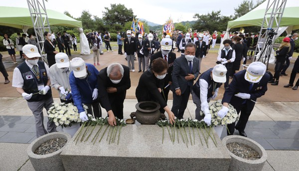 Korean War veterans, wearing white caps, and other participants place flowers to pay their respects during a ceremony to mark the 70th anniversary of the outbreak of the Korean War in Cheorwon, near the border with North Korea, South Korea, Thursday, June